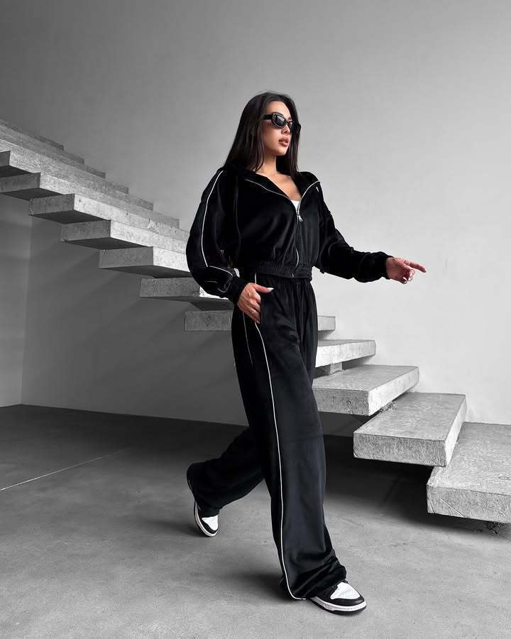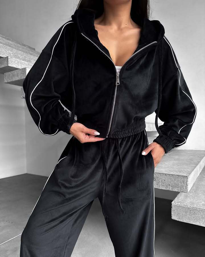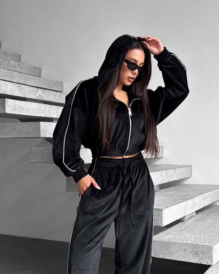 Ensemble deux pièces : gilet à capuche et pantalon large à nouer.