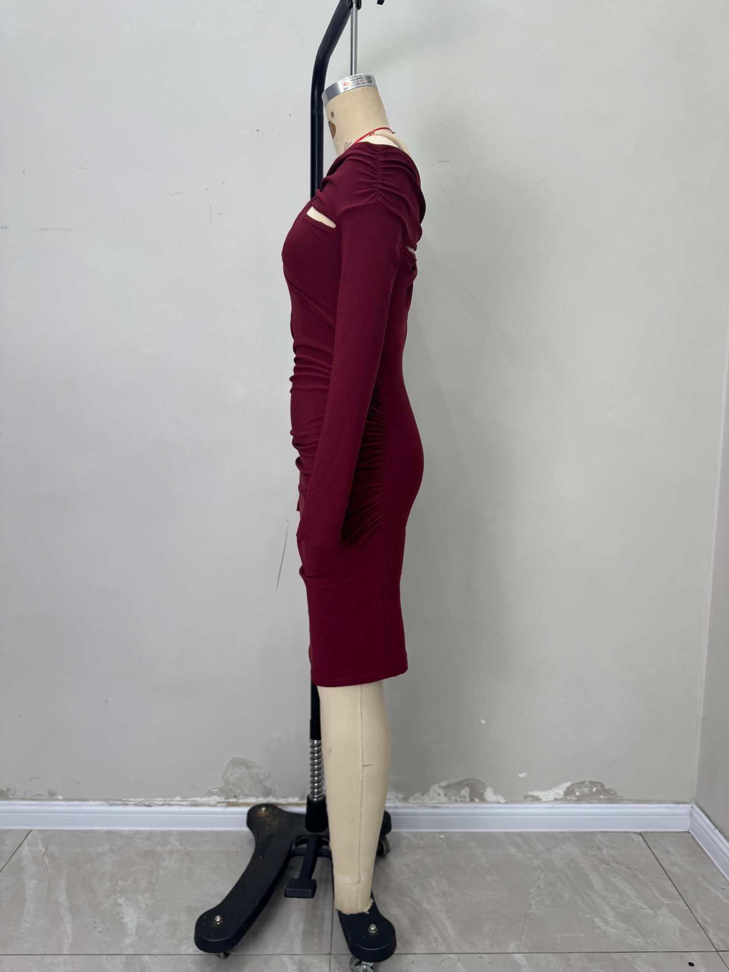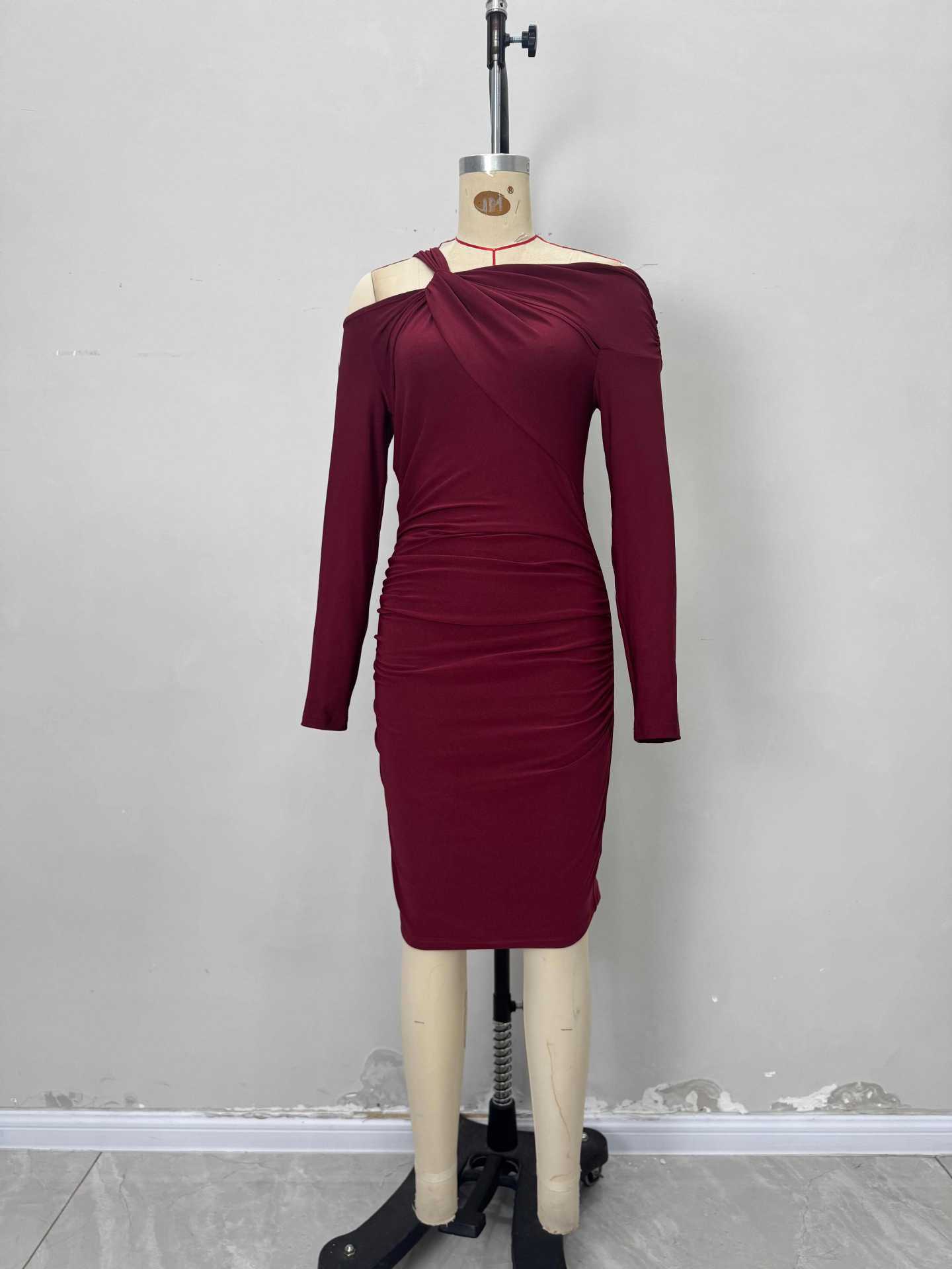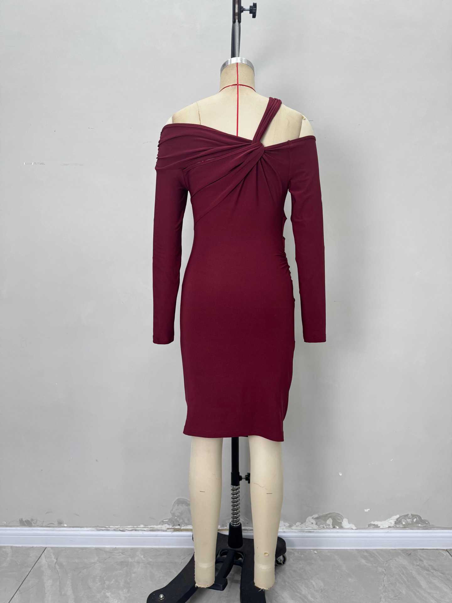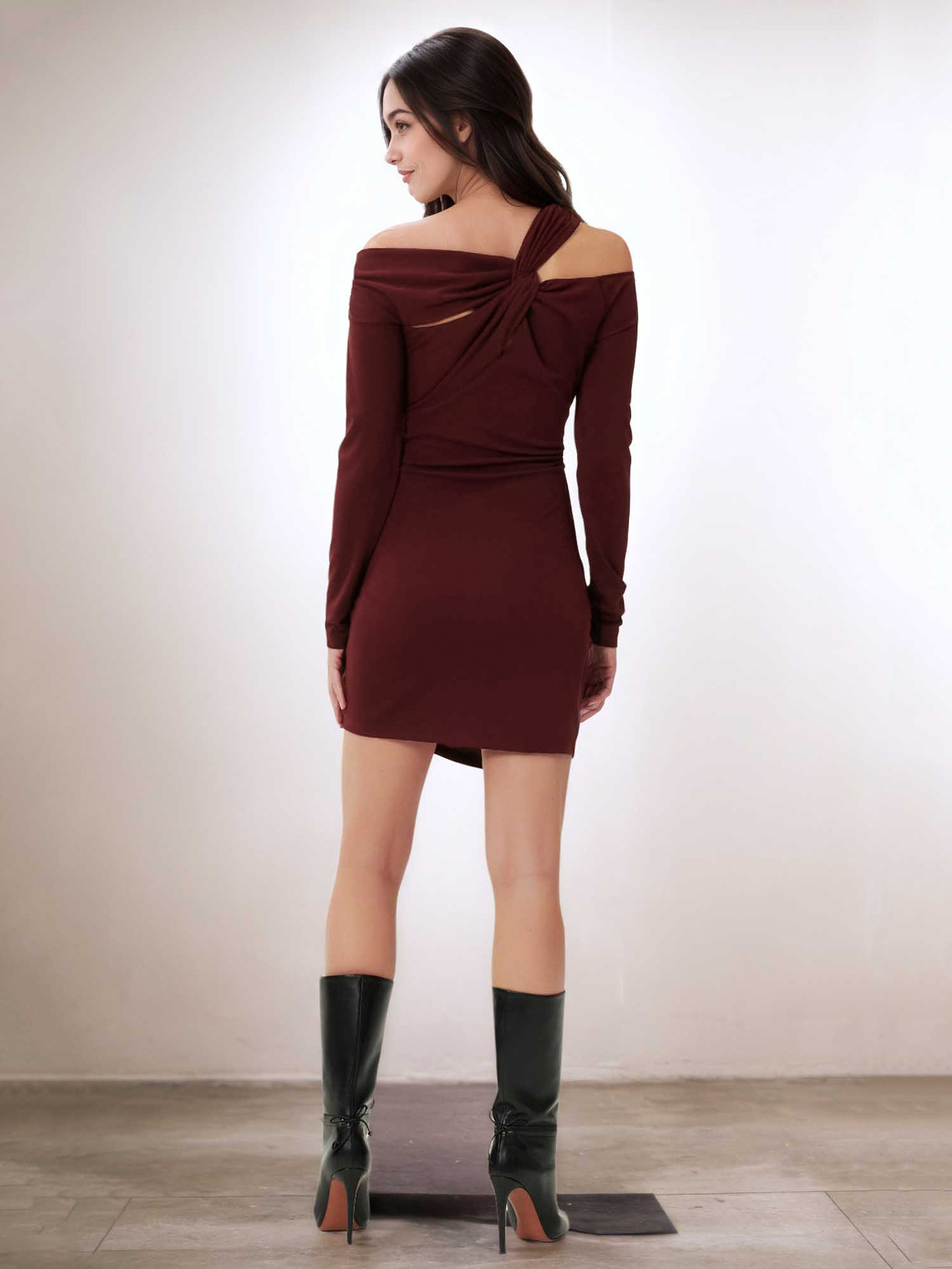 Robe cintrée à épaules dénudées, col torsadé, manches longues