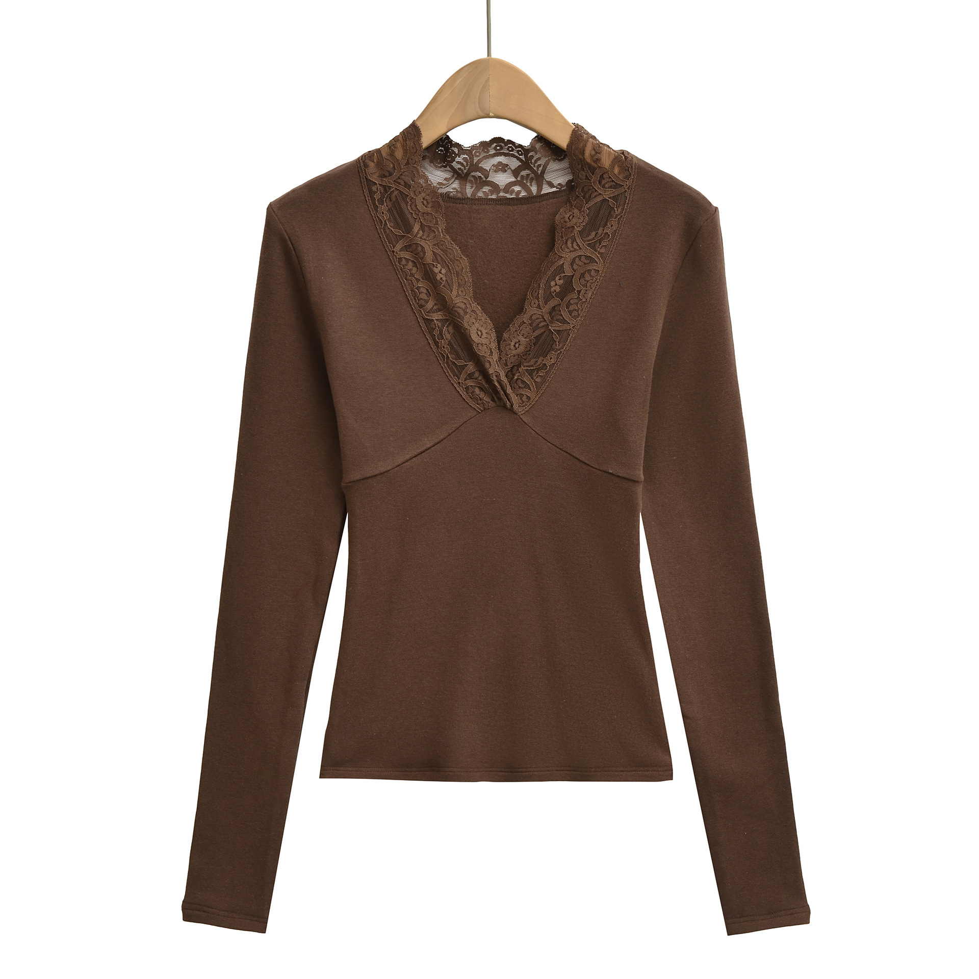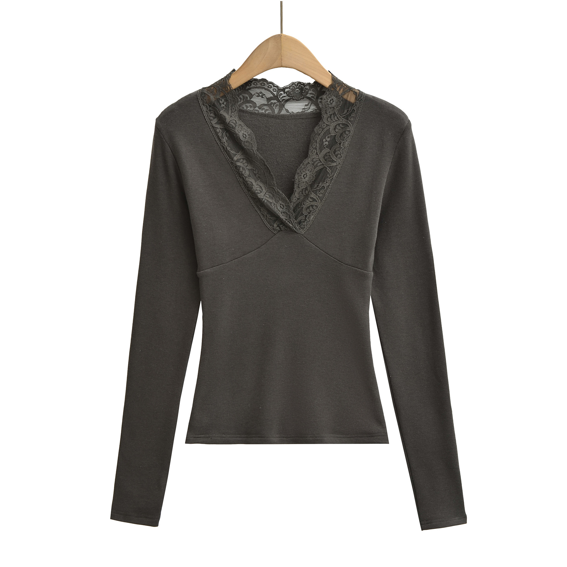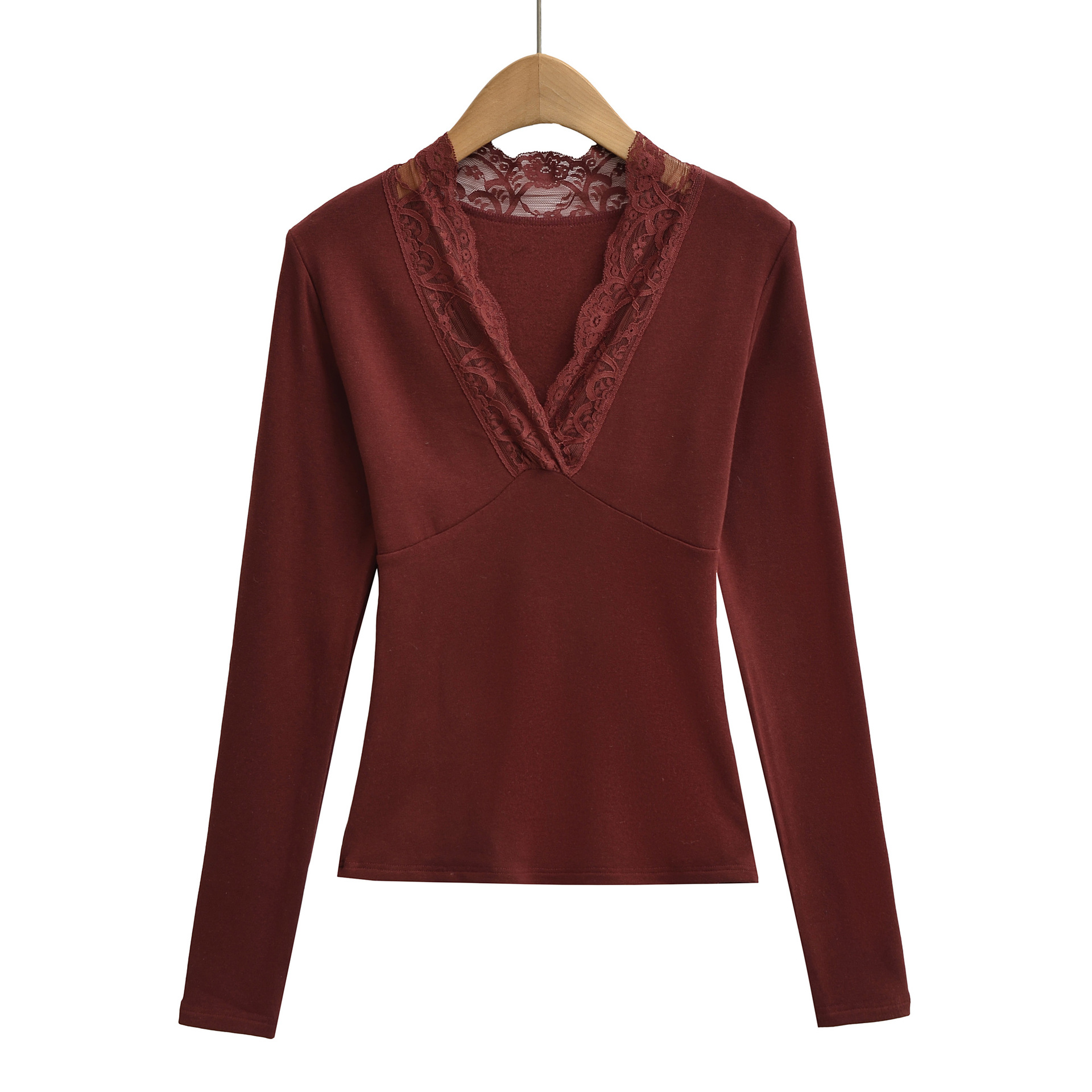 T-shirt à manches longues, col en V bordé de dentelle